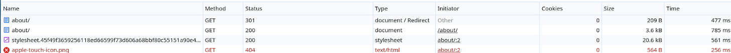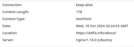 This is a digression about this response: In the response we received status code 301 (Moved Permanently) . It may look concerning at first sight that why we haven't received the `http://daffa.info/about` page. When we look closer at the `prox_req` function we see that it prevents request from being redirected. Fragment of `proxy_req` function: response = requests.request( method, url, headers=headers, data=data, verify=False, allow_redirects=False # Prevent following redirects) When we send the same request from a browser, we can see that we are redirected to the same url, but upgraded from `http` to `https`. The redirect address is specified in `Response header` as the 'Location' header.